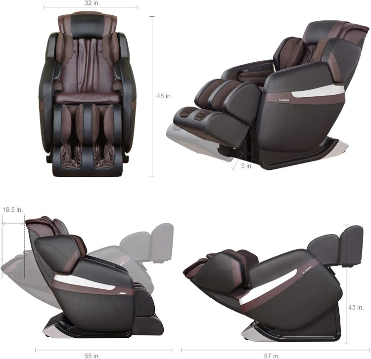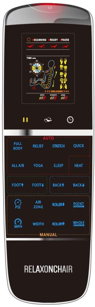 - ONE HAND BACK-LIT REMOTE CONTROLLER – With back-lit buttons & small size, you can easily control your massage in total darkness ** 30 MINUTE TIMER – You can enjoy uninterrupted massages for up to 30 minutes ** FOOT REST EXTENSION – Foot rest can be extended 6″ for taller users ** SLEEP MODE ACTIVATED – At the end of massage session, the chair remains in reclined or zero gravity position so if you fall asleep during your massage, you will not be interrupted after massage session is completed